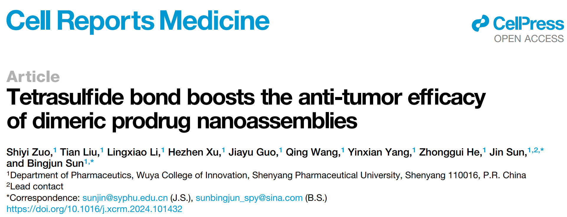 2024年2月21日,beat365官方网站孙进/孙丙军团队在Cell旗下子刊《Cell Reports Medicine》(IF=14.3)发表题为“Tetrasulfide bond boosts the anti-tumor efficacy of dimeric prodrug nanoassemblies”的研究文章,进一步探讨四硫键在构建前药自组装纳米递送系统中的应用。beat365官方网站孙进教授和孙丙军教授为此文通讯作者,2021级博士生左诗意为第一作者,beat365官方网站为唯一通讯单位。