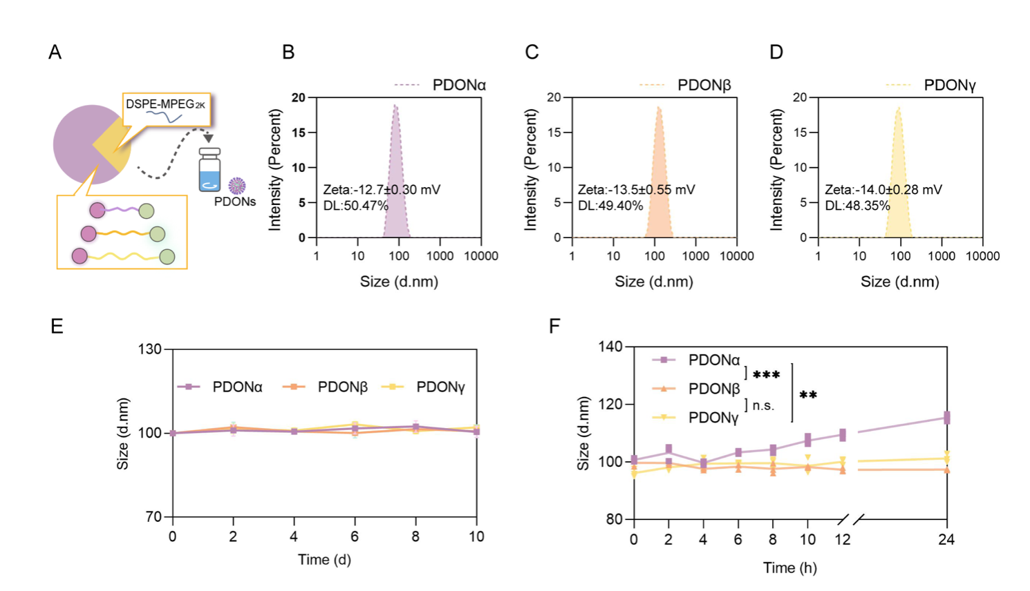 作者首先合成了具有差异化响应模块的3种多西他赛前药,并通过一步纳米沉淀法制备了PDONs(图2),粒径均在100-110 nm左右,载药量超过45%,优于传统的多西他赛纳米递释系统(如脂质体或聚合物纳米粒)。进一步考察PDONs的胶体稳定性,PDONβ被赋予了最强的稳定性。相反,PDONα的稳定性则相对较低,而PDONγ的稳定性则介于两者之间。这种差异可能间接暗示了PDONs的体内命运。