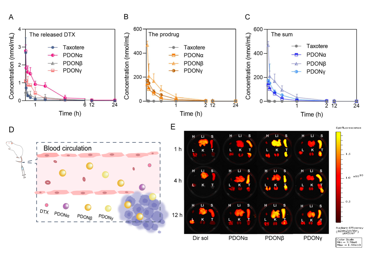使用HPLC-MS测定了PDONs在大鼠体内的药动学。如图5所示,PDONα/β/γ的AUC0~24 h(前药和母药之和)分别为Taxotere®的71倍、223倍和143倍,表明PDONs具有更长的体内滞留时间,为肿瘤靶向蓄积提供了有力的支持。此外,前药在体内的转化效率仍然呈现“U”型曲线,转化效率越快的前药纳米组装体,其 AUC0~24h 值越小。