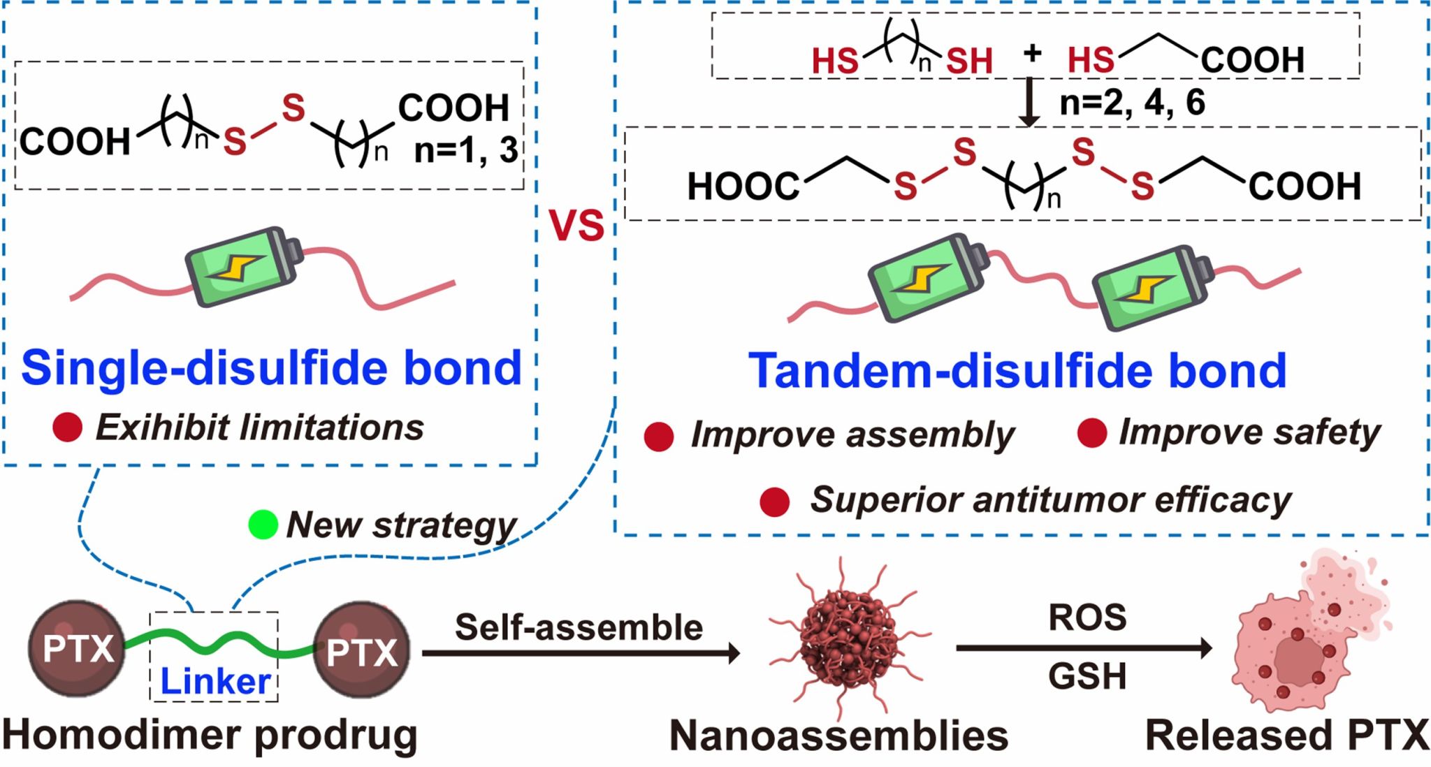 氧化还原反应性同源二聚体前药(HPs)由两个相同的药物分子组成,它们通过氧化还原反应化学键桥连,可以在水性介质中自发聚集成纳米组装体,而不需要辅助载体。与脂质体和胶束等载体依赖性药物递送系统相比,氧化还原反应性同源二聚体前药纳米组装体(RHPNs)结合了前药和纳米技术的优点,具有超高的载药量(超过60%),避免了载体相关的毒性。此外,氧化还原反应化学桥连可以由肿瘤特异性微环境中的氧化还原物质触发,从而实现选择性药物释放。