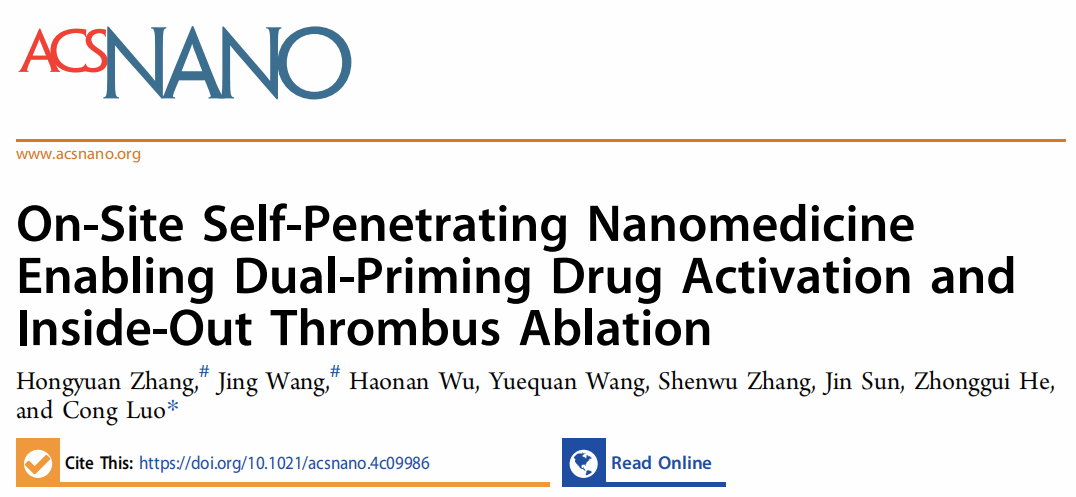 近日,beat365官方网站罗聪教授团队在《ACS Nano》(IF=15.8)在线发表了最新研究成果“On-Site Self-Penetrating Nanomedicine Enabling Dual-Priming Drug Activation and Inside-Out Thrombus Ablation”。该研究提出了一种基于光热/光动双效光敏剂与氧化响应抗血小板前药共组装实现多模式激活抗血栓前药的新策略,有望解决血栓ROS异质性导致的前药激活瓶颈难题。在该研究中,作者首先设计合成了一种抗血小板药物替格瑞洛(TGL)的氧化响应前药(TGL-S-Fmoc, TSF)。随后,发现TSF可以与光热/光动双功能的光敏剂IR808共组装形成稳定的纳米结构。基于此,作者开发了一种自穿透、自激活、多模式协同的无载体纳米组装递药系统(T-TSFI NAs)。在光热效应的辅助下,T-TSFI NAs不仅能够实现血栓的深部穿透,还通过产生ROS协同内源性ROS触发前药按需激活,栓块内部释放抗血小板药物TGL,从而实现光热/抗血小板协同溶栓。T-TSFI NAs在FeCl₃诱导的大鼠颈动脉血栓模型中不仅有效抑制了血小板的激活和聚集,还显著降低了出血风险。这一策略成功克服了血栓微环境中ROS分布不均的难题,为抗血栓前药按需高效激活提供了新思路。