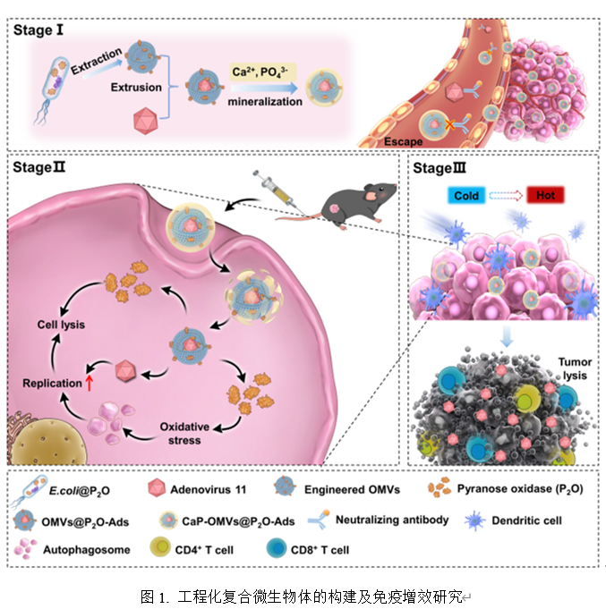 溶瘤病毒(OVs)疗法作为一种具备高效选择性和良好肿瘤杀伤能力的免疫疗法,近年来备受关注。然而,静脉递送效果差、瘤内复制效率不佳及免疫激活能力弱等关键问题制约着OVs临床应用。为此,beat365官网孙进教授团队报道了基于工程化细菌外膜囊泡(OMVs)的OVs静脉递送系统来提高OVs免疫治疗效率。首先,作者通过基因工程手段获取含吡喃糖氧化酶(P2O)的OMVs。之后采用该囊泡为载体,通过挤压法在其内部荷载OVs,并利用仿生矿化技术在其表面修饰纳米级无定形磷酸钙。该系统屏蔽了表位抗原,能够延长在体循环时间,通过EPR效应促进OVs在肿瘤处的富集。利用P2O的催化作用能够有效提升肿瘤内氧化应激水平,促进癌细胞过度自噬,并以自噬小体为复制场所,增加OVs复制效率。此外,OMVs作为免疫激活剂,可重塑肿瘤免疫抑制微环境,进而增强OVs介导的抗肿瘤免疫响应。本项目将为OVs介导的抗肿瘤免疫增效提供重要的理论基础和可行的解决策略。相关成果发表在《Nature Communications》期刊,论文题目为:Engineered bacterial outer membrane vesicles encapsulating oncolytic adenoviruses enhance the efficacy of cancer virotherapy by augmenting tumor cell autophagy。