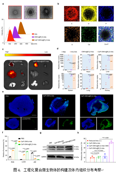 为解决临床溶瘤病毒类制剂系统性给药困难的问题,在此借助仿生矿化技术在溶瘤病毒复合微生物体的表面修饰纳米级无定形磷酸钙,构建了工程化复合微生物体,并对其制剂学性质及体内命运进行了研究。如图4a和4b显示,工程化复合微生物体成功构建。随后,作者考察了工程化复合微生物体经尾静脉注射后的组织分布情况(图4c-d)。结果显示,相较于裸Ads及未矿化的复合微生物体,工程化复合微生物体的瘤内蓄积含量明显提高。随后,作者利用免疫荧光技术及western blot技术证明了工程化复合微生物体在肿瘤处产生ROS及诱发肿瘤组织自噬的能力(图4e-g),并考察了工程化复合微生物体在体内肿瘤处促进Ads复制的能力(图4h)。