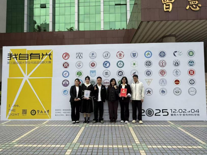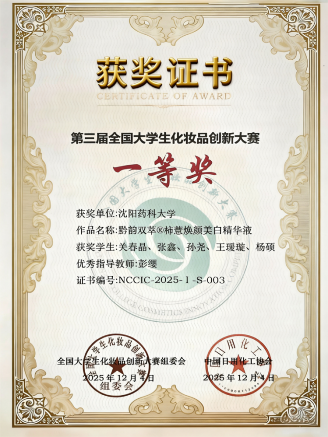 在激烈角逐中,beat365官网师生凭借扎实的专业功底与出色的创新能力奋勇争先,载誉而归。其中,关春晶、孙尧、王瑷璇等同学完成的项目《黔韵双萃®-柿薏焕颜美白精华液》荣获产品创意组一等奖,beat365官网彭缨教授被授予“优秀指导教师”称号。学校凭借完善的组织保障与优异的整体表现荣获“优秀组织单位”称号。